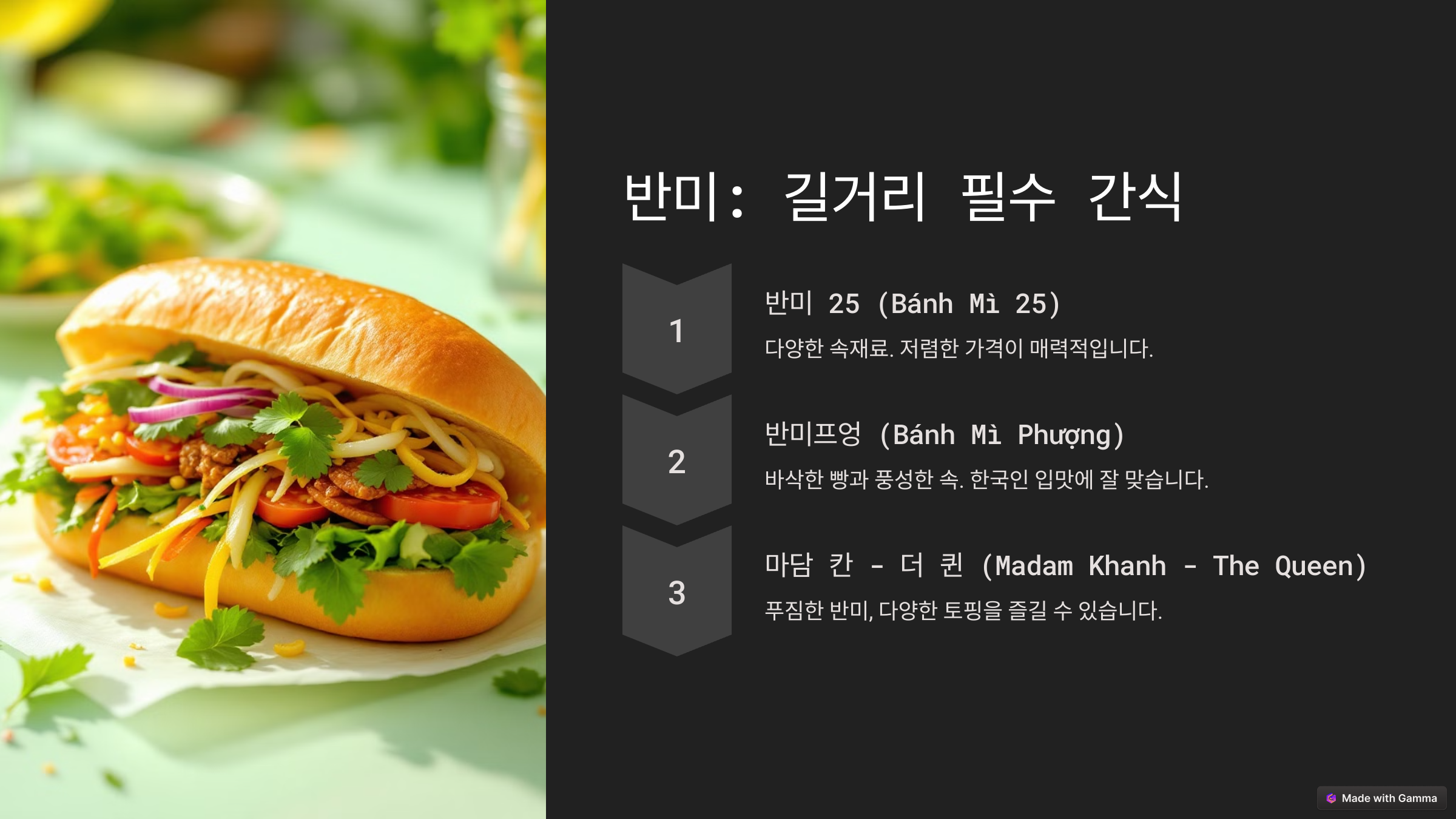 프랑스 바게트에 베트남 특유의 재료를 넣어 만든 샌드위치로, 바삭한 빵과 다양한 속재료가 어우러져 훌륭한 맛을 자랑합니다.